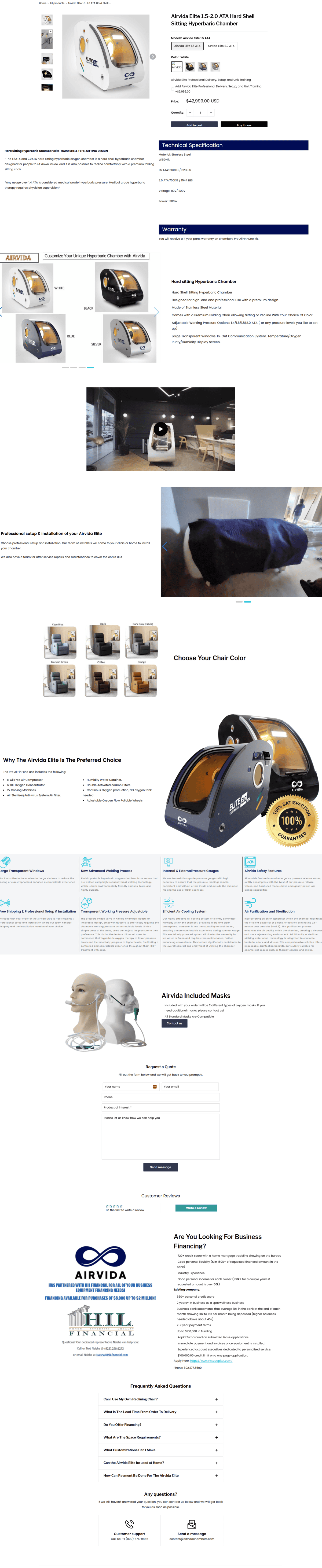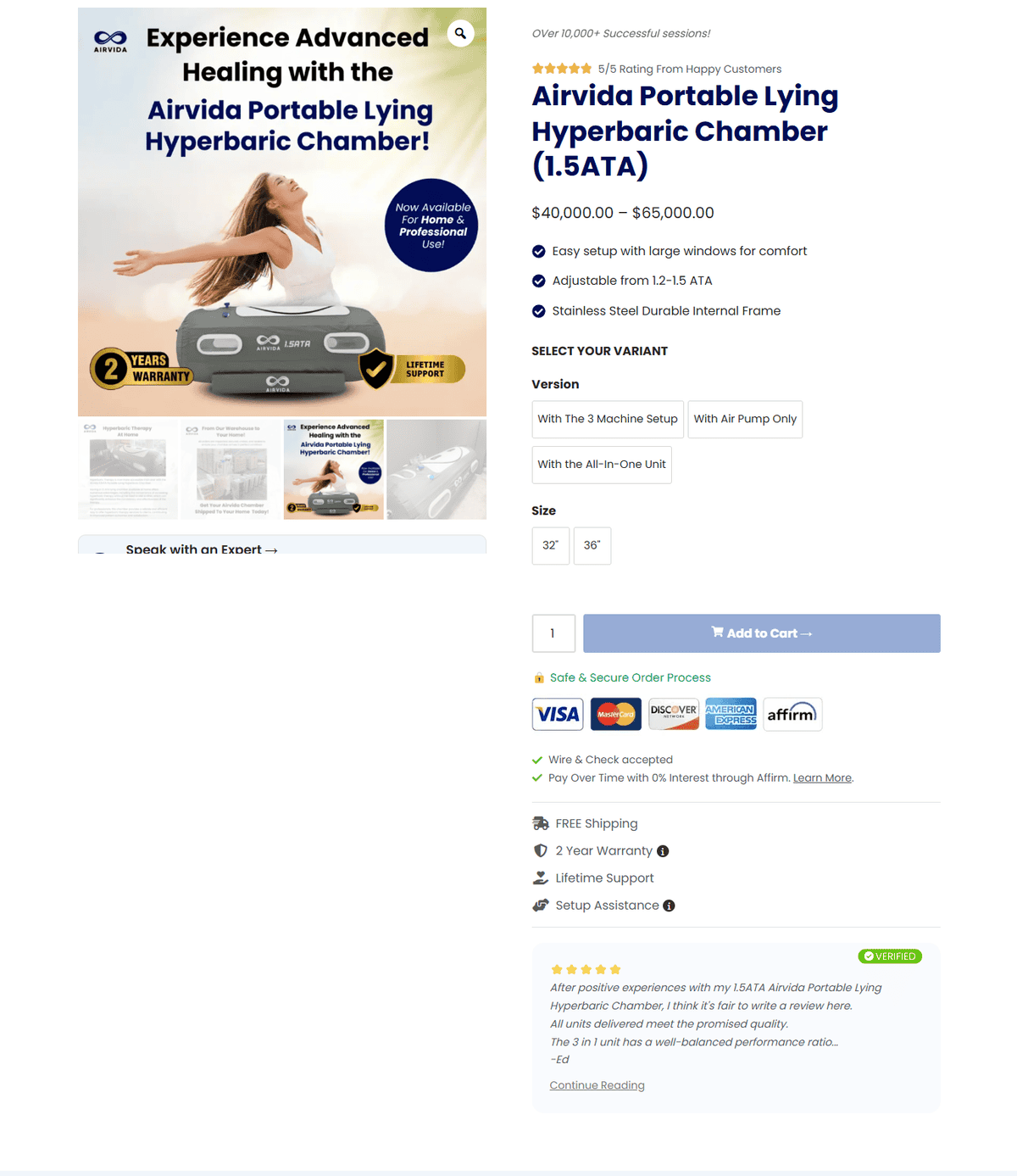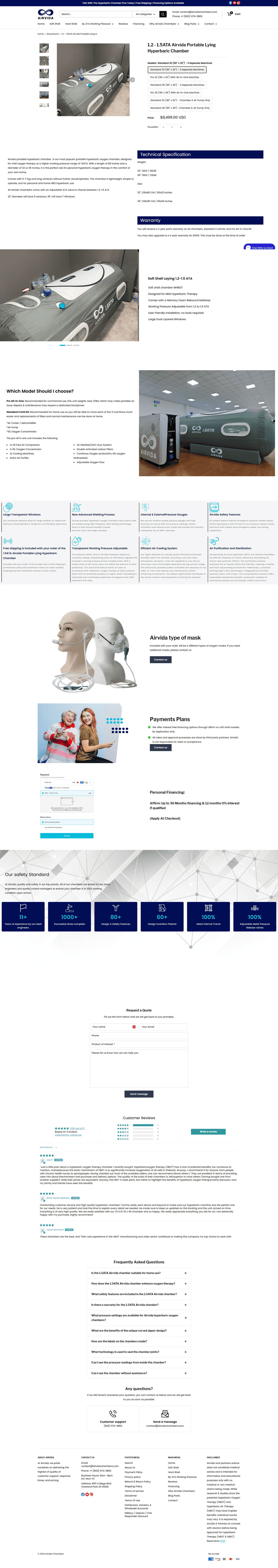 A product page for a soft shell oxygen chamber (that can be used at home or commercially).