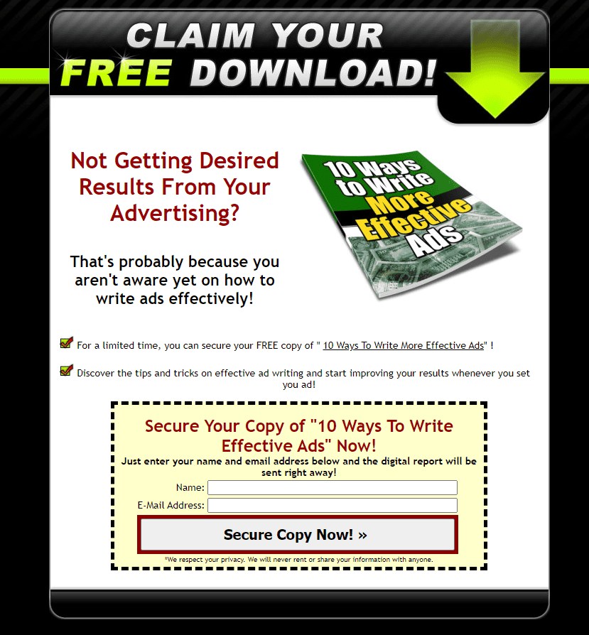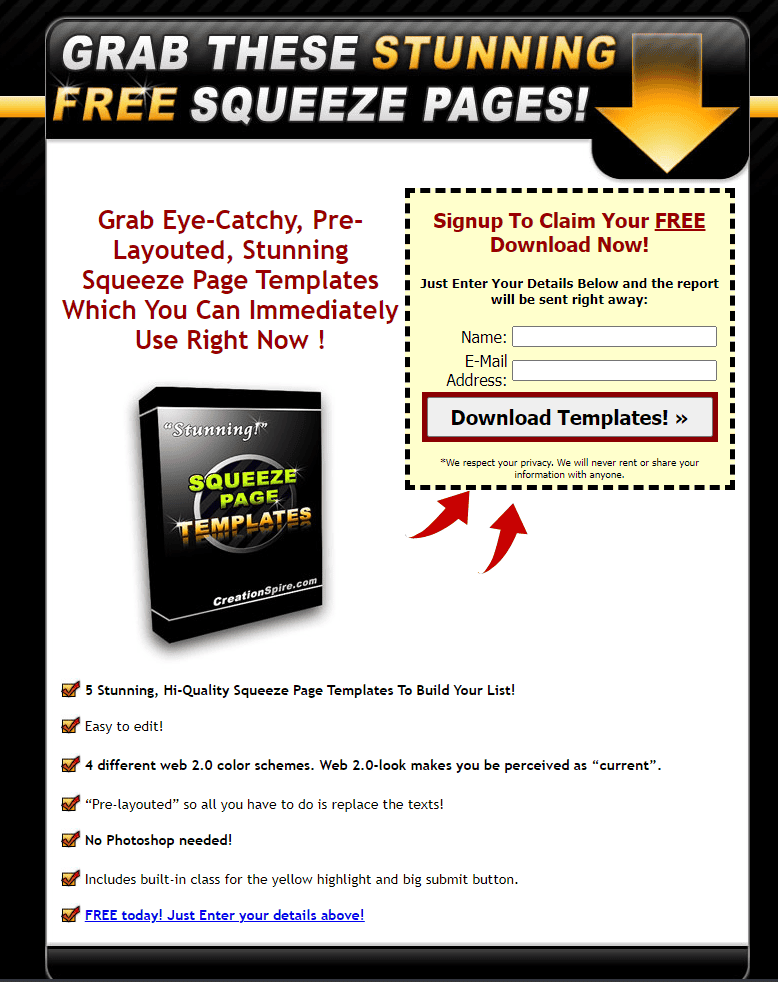 An HTML Squeeze page template bundle. The design for this was to have a prominent big arrow pointing to the optin form.