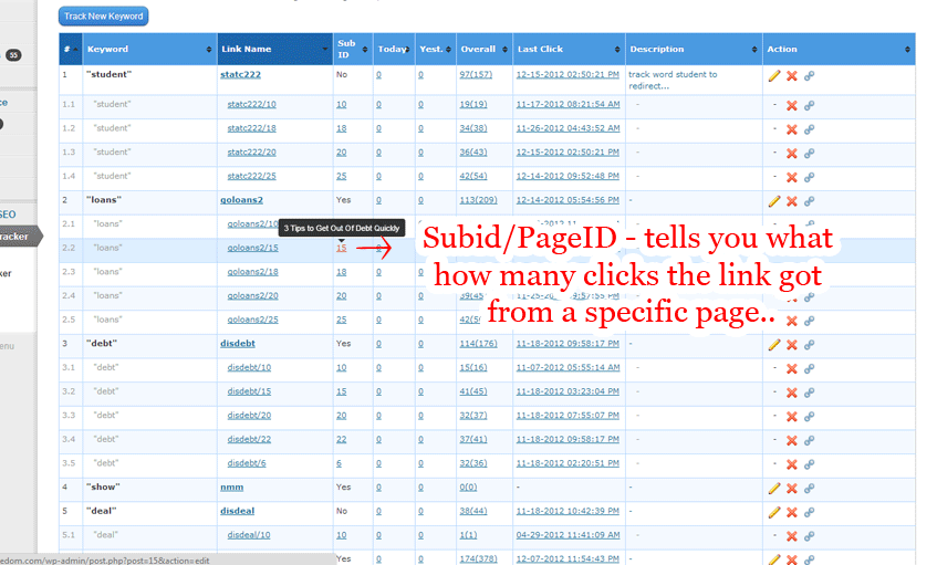 A wordpress plugin I have had made that tracks clicks, renames and rotates links and can add subids to url links on the fly. Also converts keywords in post into links. Was useful if you advertise your links on different platforms and you just want to know which gets most clicked.